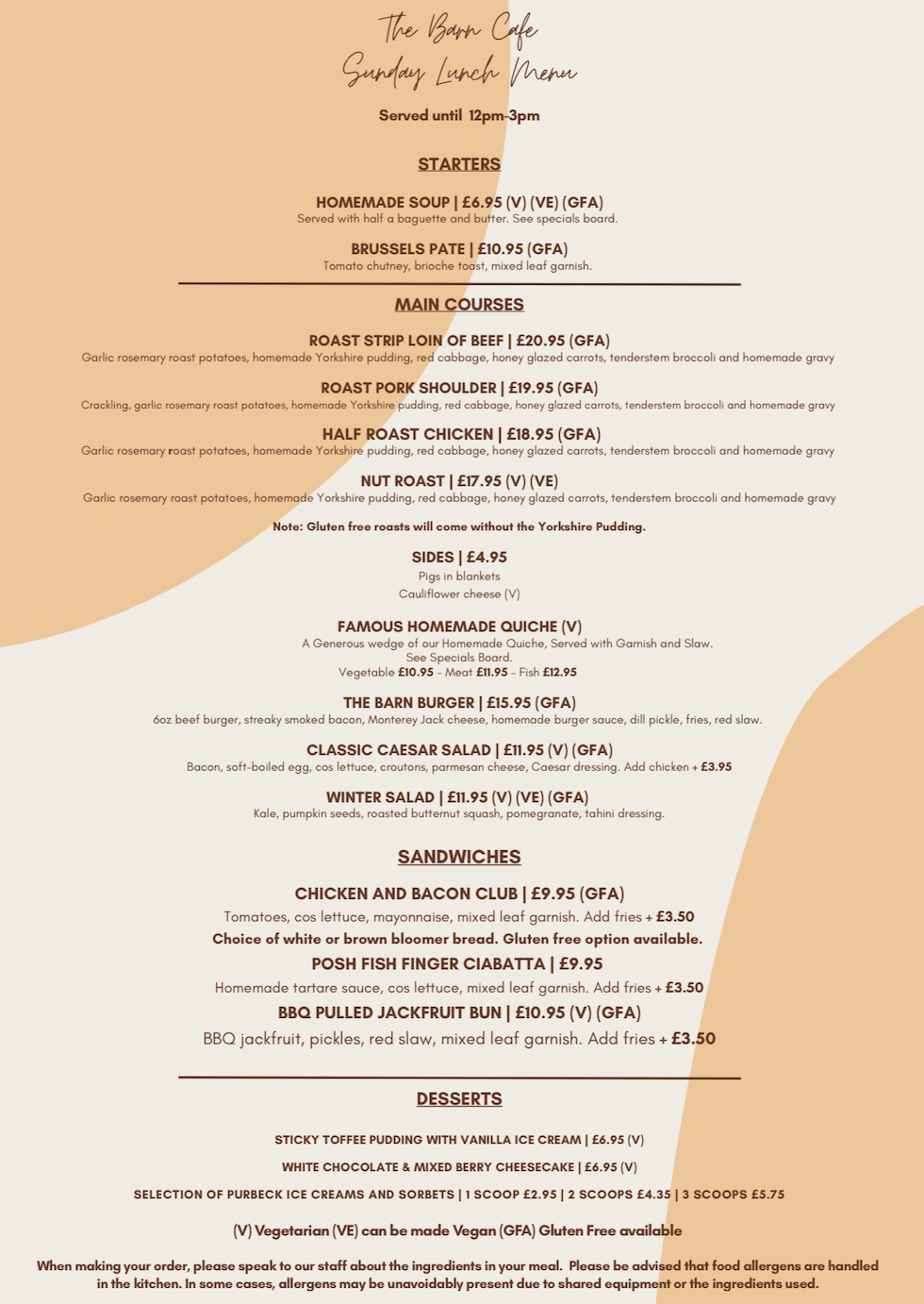 Whether you're in the mood for a hearty Barn Full English, a light lunch, homemade quiche, or a traditional afternoon tea, our menu is packed with freshly cooked dishes made to order. We also offer an extensive Gluten Free menu and are happy to cater for other dietary requirements.